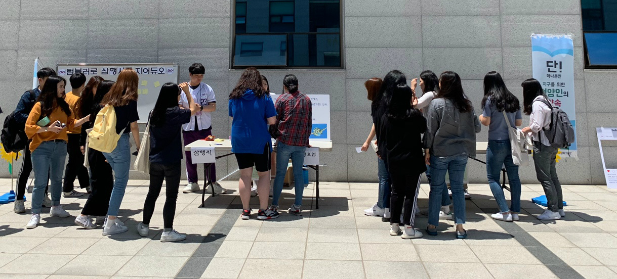 건양대 총학생회, 텀블러 캠페인으로 친환경 캠퍼스 구축 나서 건양대학교(총장 이원묵) 총학생회 듀오(학생회장 조우현)가 30일 오후 대전과 논산 양대 캠퍼스에서 친환경 캠퍼스 구축을 위해 1회용 종이컵 사용을 자제하고 1인 1텀블러 사용을 촉진하는 캠페인을 진행했다. 이번 캠페인은 대학생들이 도서관 등에서 일회용 종이컵을 이용하는 경우가 많고 최근 날씨가 더워지면서 교내 카페에서의 일회용 플라스틱 용기 사용이 폭증함에 따라 개인 텀블러 활용 캠페인을 통해 폐기물을 줄이고 궁극적으로 친환경 캠퍼스를 구축하자는 취지에서 이루어졌다. 이날 캠페인은 텀블러 삼행시 짓기, 일회용 컵 사용에 대한 심각성에 대한 글을 남기는 등 친환경 의식을 높일 수 있는 간단한 활동을 진행한 학생에게 텀블러를 무료로 제공하는 방법으로 진행됐다. 앞서 이달 9일 건양대는 태양열 발전, 푸드마일리지 개념 도입, 리사이클링 운동 등 우리 자연과 미래를 생각하는 친환경 캠퍼스 구축을 선언하고 나부터 환경을 위한 작을 실천을 시작하는 <Me First> 캠페인을 시작한 바 있다. <Me First> 캠페인의 일환으로 진행된 이날 텀블러 캠페인을 위해 학교당국은 상품으로 활용된 텀블러를 무료 지원했으며 앞으로도 총학생회와 함께 학생들에게 지속적인 텀블러 제공을 진행할 계획이다.