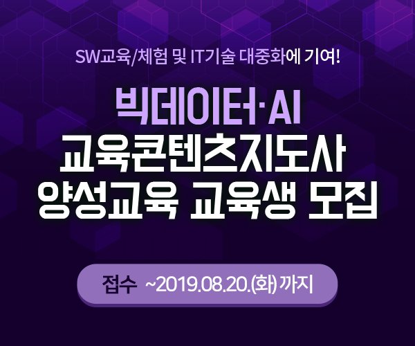 | 제목 | (~8/20)한국여성과학기술인지원센터 2019년 [빅데이터, AI 교육컨텐츠지도사 양성교육]교육생 모집 안내 | ||||