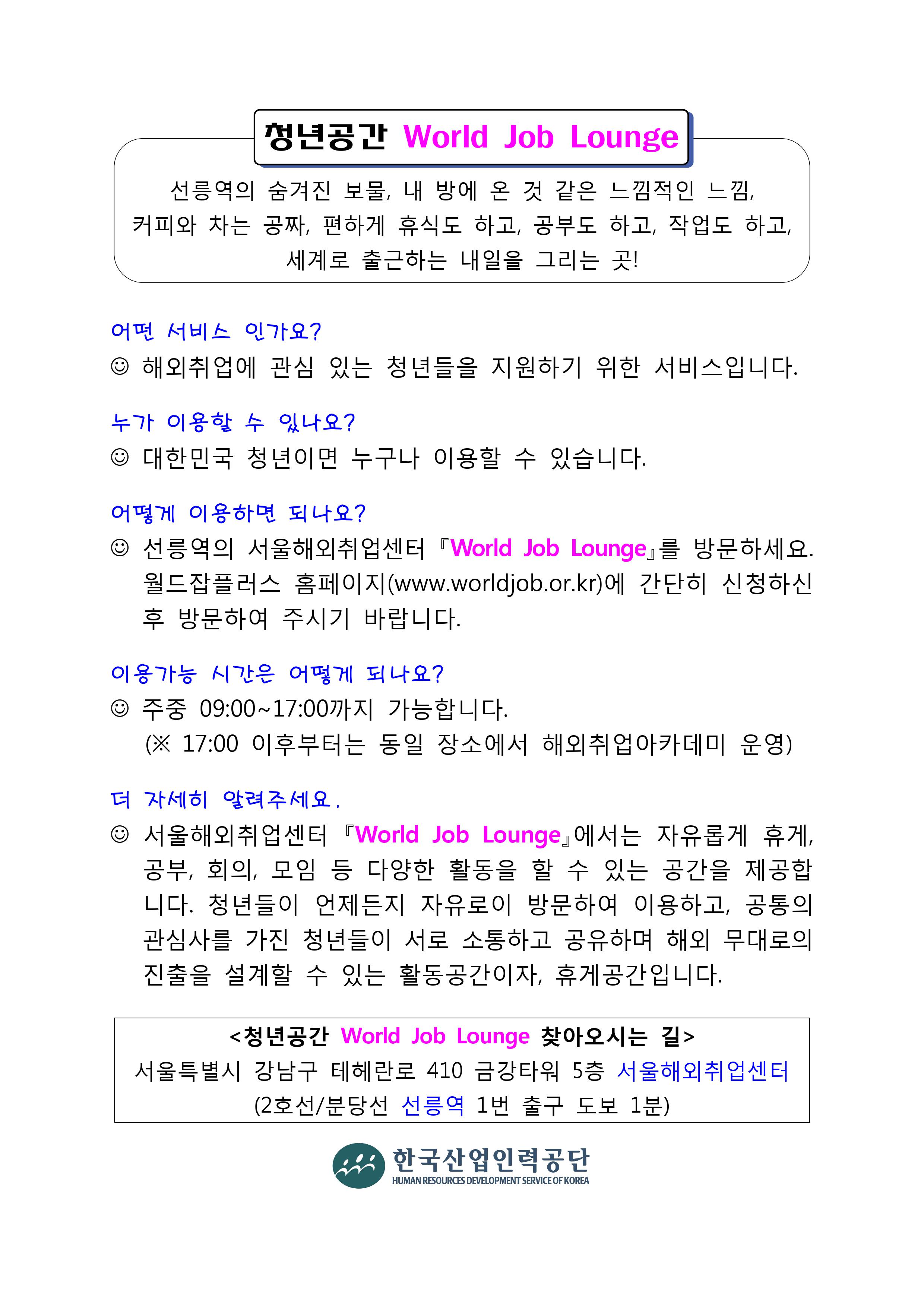 서울해외취업센터 [청년공간 World Job Lounge] 무료개방 안내 글의 상세내용