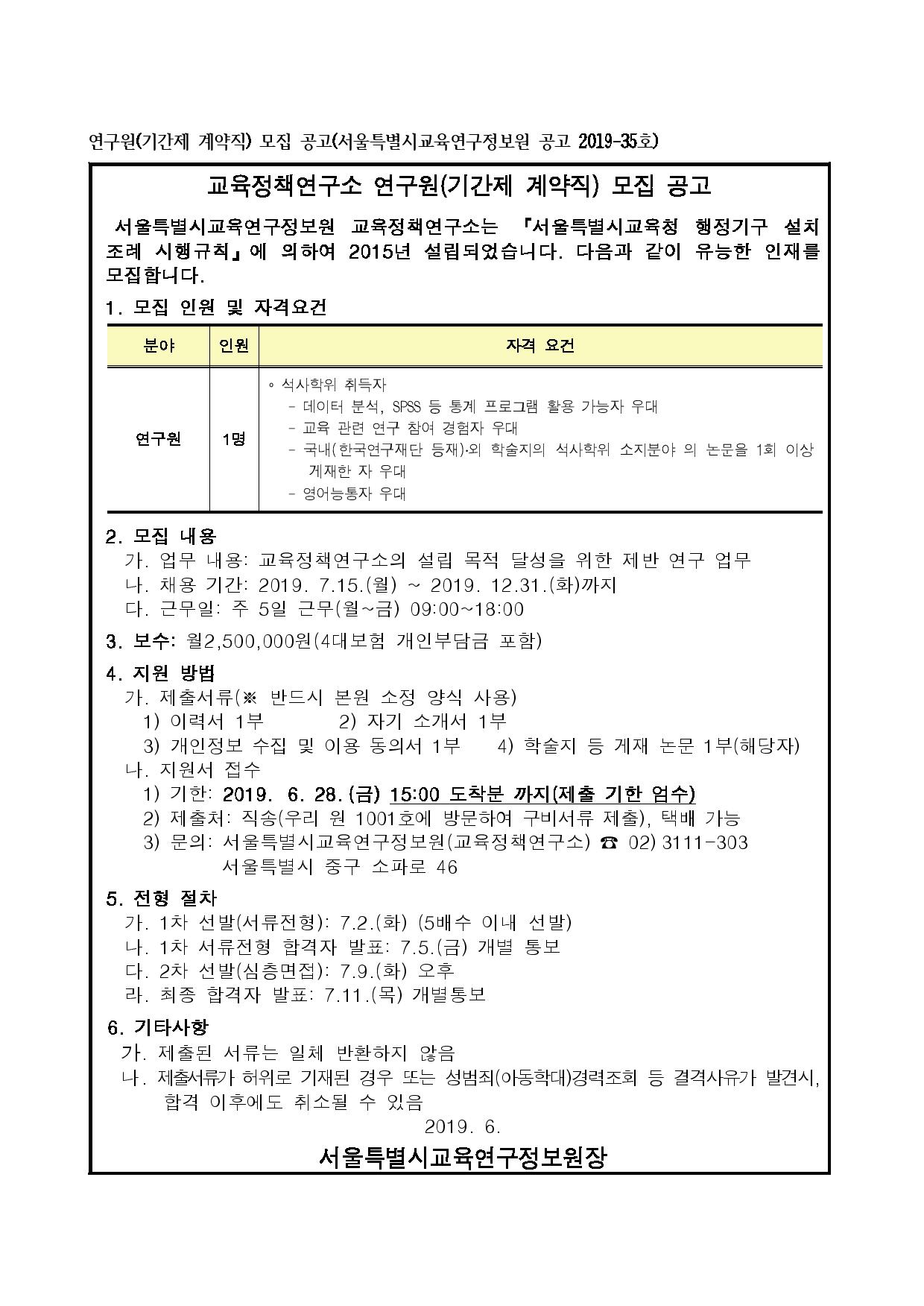 | 제목 | (~6/28)교육정책연구소 연구원(기간제계약직) 모집공고 안내 | ||||