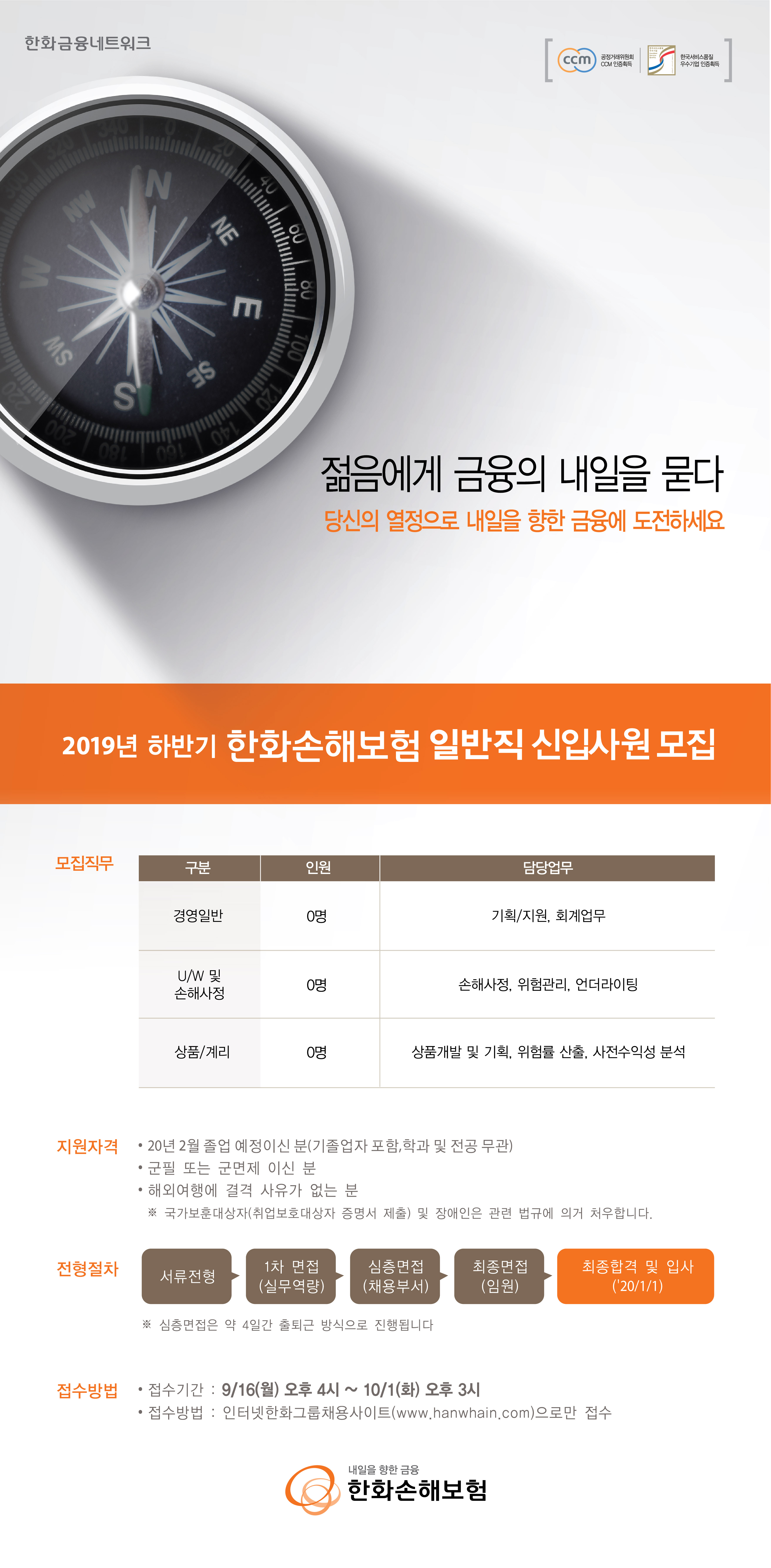 (~10/1) [한화손해보험] 2019 하반기 일반직 신입 모집 안내 글의 상세내용