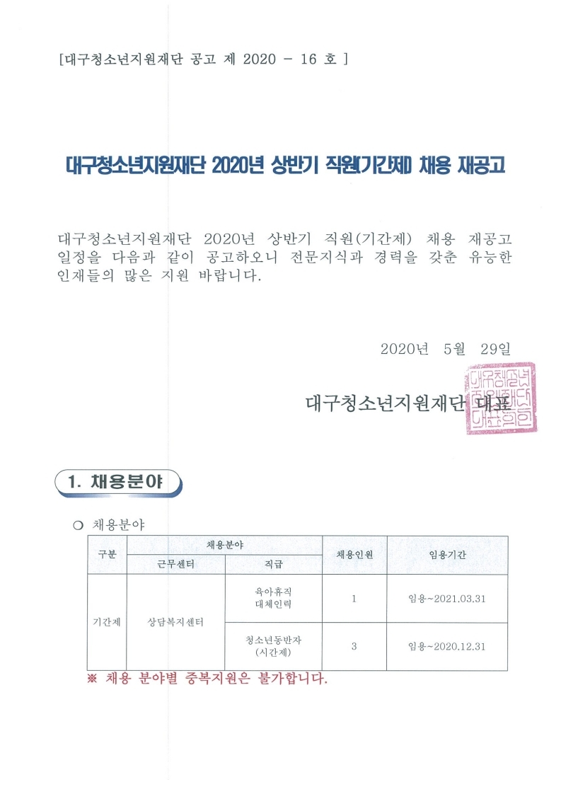 | 제목 | (~6/9)[대구청소년지원재단]기간제 직원 채용 | ||||