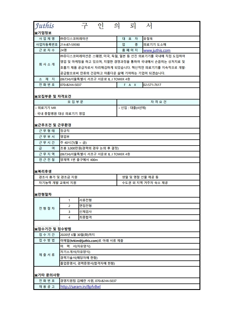(~6/30)[(주)쥬디스코퍼레이션]의료기기 MR 모집 글의 상세내용