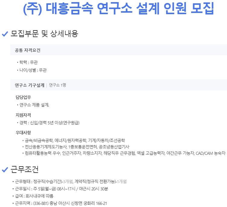 [(주)대흥금속]연구소 기계설계 인원 모집 글의 상세내용