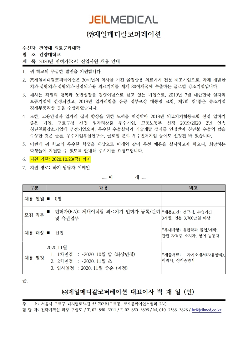 제목 (~10/23)[(주)제일메디칼코퍼레이션]인허가(RA) 채용