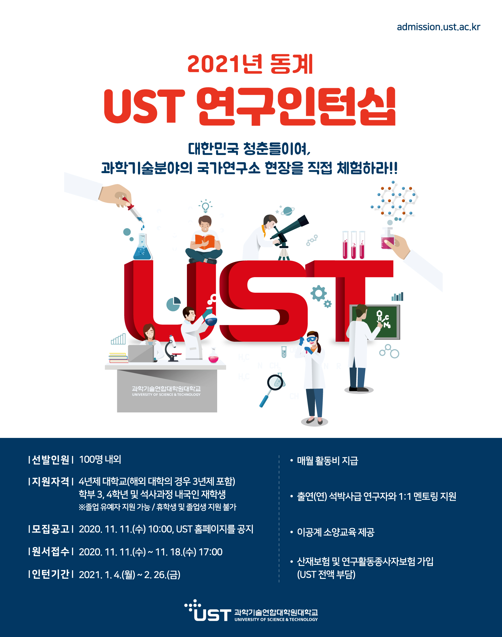 [2021년 동계 연구인턴십] 1) 운영목적: UST 캠퍼스(정부출연연구원) 체험 및 연구역량강화 기회 제공 2) 모집기간: 2020. 11. 11.(수) 10:00 ~ 11. 18.(수) 17:00 3) 지원자격: 4년제 대학교(해외 대학의 경우 3년제 포함) 학부 3, 4학년 및 석사과정 내국인 재학생(졸업유예자 지원 가능 / 휴학생 및 졸업생 지원 불가) 4) 인턴기간: 2021. 1. 4.(월) ~ 2. 26.(금) / 겨울방학 약 2개월 자세한 내용은 홈페이지(https://admission.ust.ac.kr/)확인하시기 바랍니다. 감사합니다.