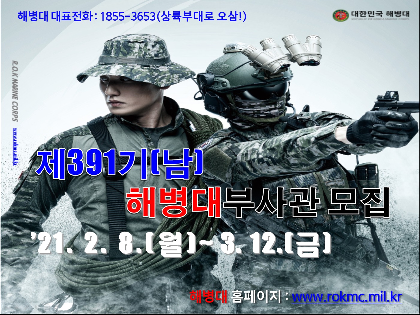 * 해병대사령부에서는 제391기 해병대부사관(남)을 모집하고 있습니다. * 모집기간은 ’21.2.8.(월) ∼ ‘21.3.12.(금)까지이며, 자세한 사항은 해병대 모집 홈페이지를 참고 바랍니다. |