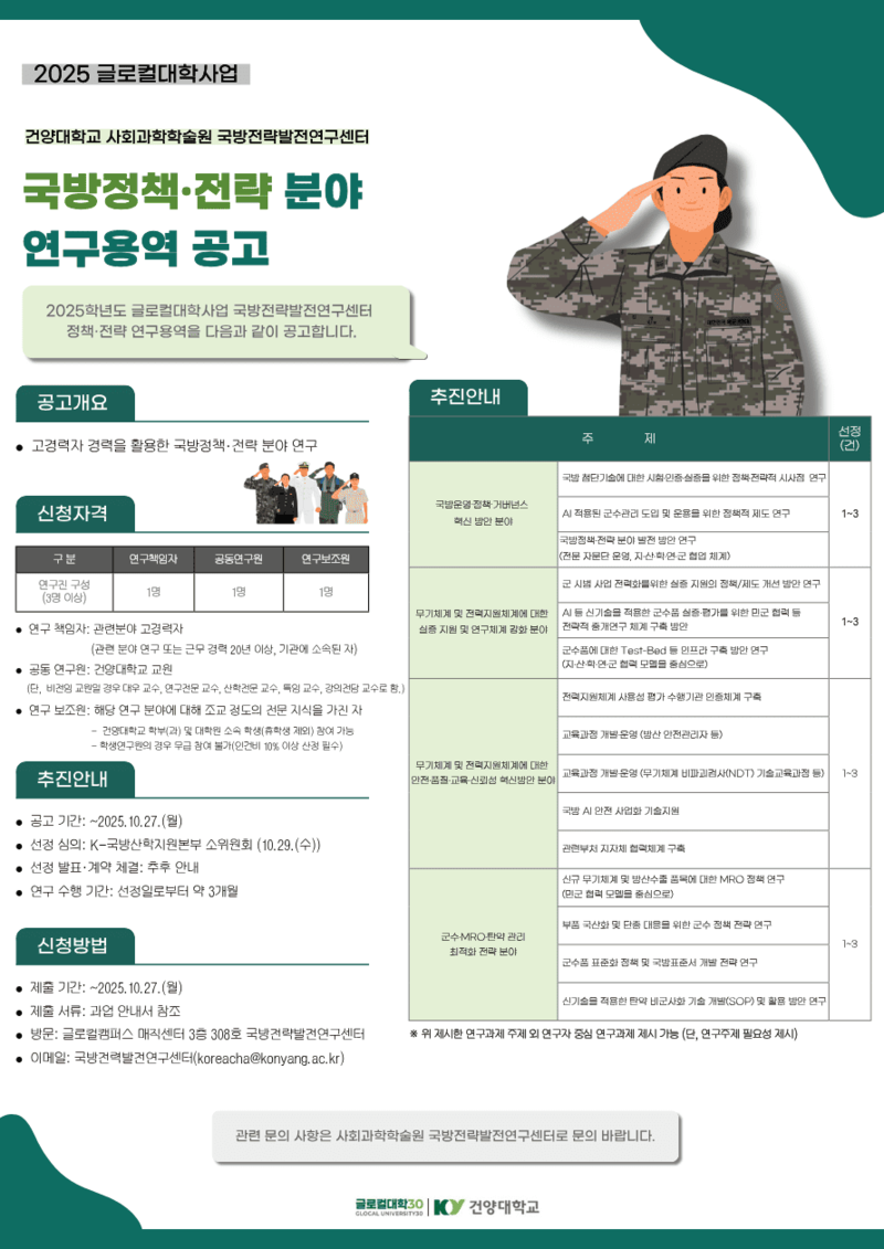 | 제목 | [글로컬대학사업] 2025 국방전략발전연구센터 국방정책·전략 분야 연구용역 공고(~ 10.27.까지) | ||||